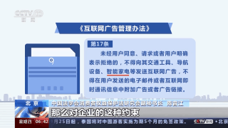 中國法學會消費者權(quán)益保護法研究會副秘書長 陳音江:廣告法里面規(guī)定得就比較粗一些,任何單位或個人,你沒有經(jīng)過當事人的同意,不能夠向這種住宅或者說交通設(shè)施上去投放廣告,但是用的是“等”,就沒有這么具體。修訂實施的《互聯(lián)網(wǎng)廣告管理辦法》里面,它就明確地說了包括智能家電,你沒有經(jīng)過同意,你也不能夠往它里面去發(fā)送這種廣告。這幾年,針對智能家電的這種廣告它的規(guī)定越來越具體,那么對企業(yè)的這種約束也應(yīng)該是越來越具體,或者說它這種合規(guī)的紅線越來越明確。