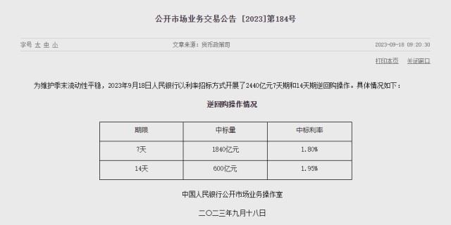 央視網(wǎng)消息:中國(guó)人民銀行發(fā)布公告,為維護(hù)季末流動(dòng)性平穩(wěn),9月18日以利率招標(biāo)方式開(kāi)展2440億元7天期和14天期逆回購(gòu)操作。