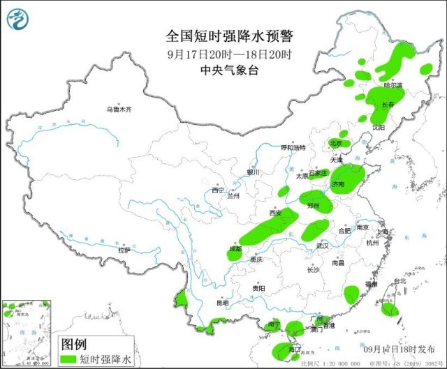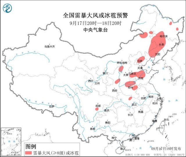 中央氣象臺9月17日18時繼續(xù)發(fā)布強對流天氣藍色預警