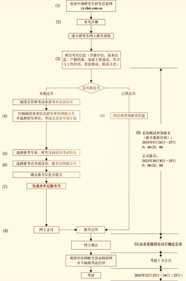 根據(jù)《2024年全國碩士研究生招生工作管理規(guī)定》要求,2023年10月8日至25日,考生可登錄“全國碩士研究生招生考試網(wǎng)上報(bào)名平臺(tái)”(https://yz.chsi.com.cn)進(jìn)行研招統(tǒng)考網(wǎng)上正式報(bào)名,報(bào)名時(shí)間為每天9:00—22:00。
