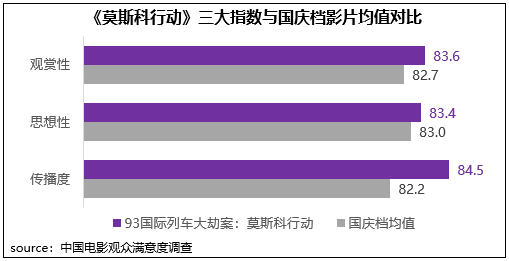《莫斯科行動》根據(jù)20世紀(jì)90年代跨境追捕搶劫案犯案件改編,在真實社會事件基礎(chǔ)之上有機融入商業(yè)化要素,三大指數(shù)得分均超83分。