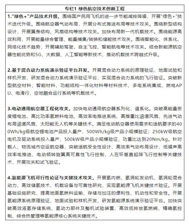 1.強(qiáng)化綠色航空關(guān)鍵核心技術(shù)攻關(guān)。持續(xù)推動(dòng)總體、氣動(dòng)、結(jié)構(gòu)、發(fā)動(dòng)機(jī)、機(jī)載、材料、制造工藝等領(lǐng)域技術(shù)升級(jí)換代,加速發(fā)展混合動(dòng)力推進(jìn)系統(tǒng),不斷提升干支線飛機(jī)、通用航空器節(jié)能減排降噪水平。加快發(fā)展高能量密度、高放電效率、高安全性的航空動(dòng)力電池技術(shù),以及高可靠性、高功重比、高效率的航空電推進(jìn)技術(shù)。加強(qiáng)高效燃?xì)鉁u輪-電能融合技術(shù)研究。引導(dǎo)優(yōu)勢(shì)企業(yè)和研究機(jī)構(gòu)持續(xù)突破智能化、高可靠性、輕量化、低成本能量控制和飛行控制技術(shù),開(kāi)展新能源飛機(jī)總體設(shè)計(jì)、能源系統(tǒng)設(shè)計(jì)、全電機(jī)載系統(tǒng)等技術(shù)攻關(guān)。持續(xù)探索氫燃料存儲(chǔ)技術(shù)、氫燃料電池技術(shù)、氫內(nèi)燃、氫渦輪發(fā)動(dòng)機(jī)技術(shù)、氫渦輪混合電推進(jìn)技術(shù)、能量綜合管理技術(shù)等氫能源飛機(jī)關(guān)鍵技術(shù)。面向國(guó)家綠色航空發(fā)展的戰(zhàn)略需要,加快布局基礎(chǔ)研究和應(yīng)用基礎(chǔ)研究,解決制約綠色航空發(fā)展的源頭和底層技術(shù)問(wèn)題。