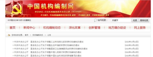 中國(guó)機(jī)構(gòu)編制網(wǎng)12日消息,中共中央辦公廳、國(guó)務(wù)院辦公廳日前發(fā)布相關(guān)通知,調(diào)整工業(yè)和信息化部、生態(tài)環(huán)境部、國(guó)家衛(wèi)生健康委員會(huì)、中國(guó)人民銀行職責(zé)機(jī)構(gòu)編制,調(diào)整中國(guó)社會(huì)科學(xué)院職責(zé)等事項(xiàng)。