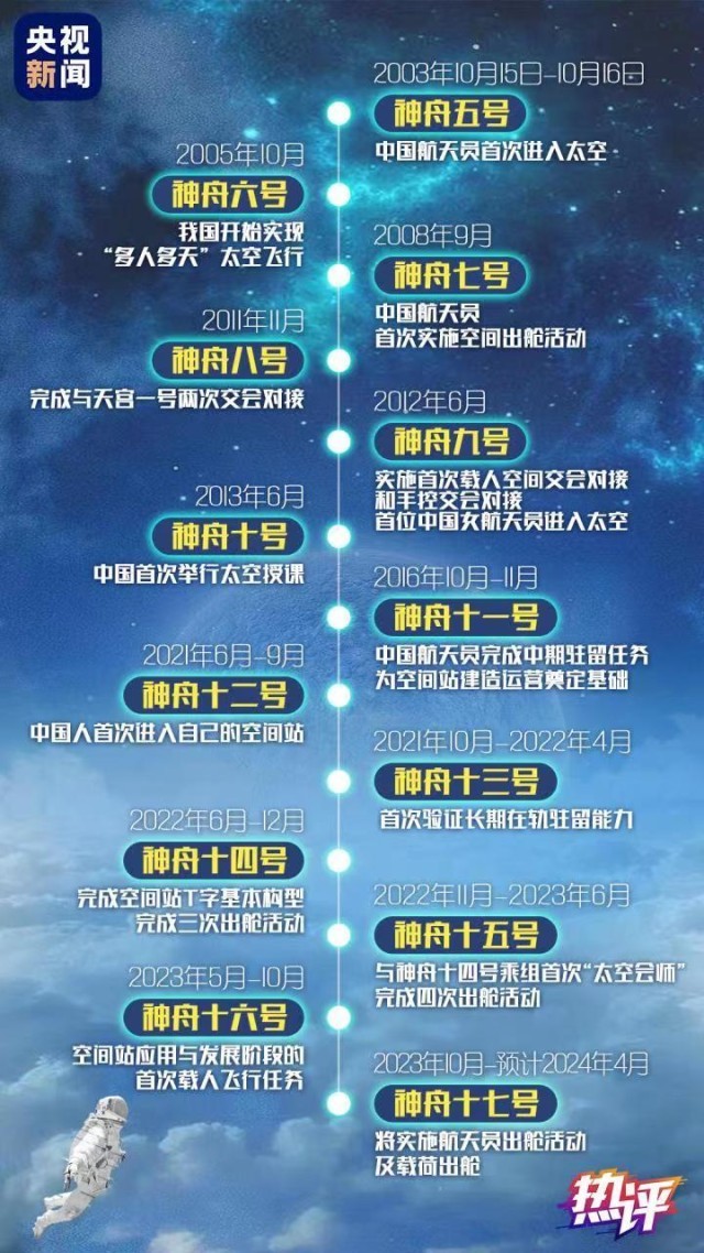 飛天20載,所向皆星河。從神五到神十七,從首次太空飛行到長(zhǎng)期駐守空間站,20年間,我國(guó)載人航天事業(yè)實(shí)現(xiàn)跨越式發(fā)展,載人航天工程發(fā)射任務(wù)實(shí)現(xiàn)30戰(zhàn)30捷。有太多高光時(shí)刻值得銘記,每一步都夯實(shí)基礎(chǔ),每一步都標(biāo)定未來(lái)。