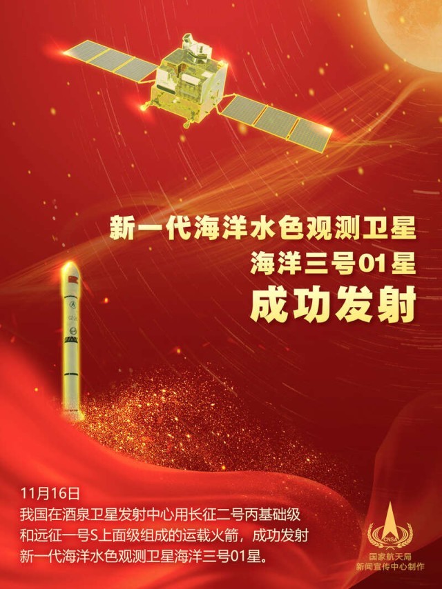 中國青年報客戶端北京11月16日電(張未 王豪 李儀 中青報·中青網(wǎng)記者 邱晨輝)北京時間11月16日11時55分,我國在酒泉衛(wèi)星發(fā)射中心用長征二號丙基礎(chǔ)級和遠(yuǎn)征一號S上面級組成的運(yùn)載火箭,成功發(fā)射新一代海洋水色觀測衛(wèi)星海洋三號01星。該衛(wèi)星指標(biāo)達(dá)到國際水色遙感衛(wèi)星先進(jìn)水平,可滿足我國海洋環(huán)境監(jiān)測的主體業(yè)務(wù)需求,并能夠服務(wù)于生態(tài)文明建設(shè)、智慧海洋工程建設(shè)、“一帶一路”倡議等國家重大戰(zhàn)略需求。