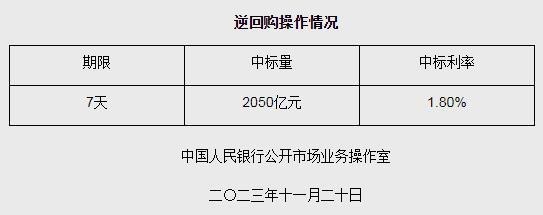 中新網(wǎng)11月20日電 據(jù)央行網(wǎng)站消息,為維護(hù)銀行體系流動(dòng)性合理充裕,2023年11月20日人民銀行以利率招標(biāo)方式開展了2050億元逆回購(gòu)操作,中標(biāo)利率1.80%,期限為7天。具體情況如下: