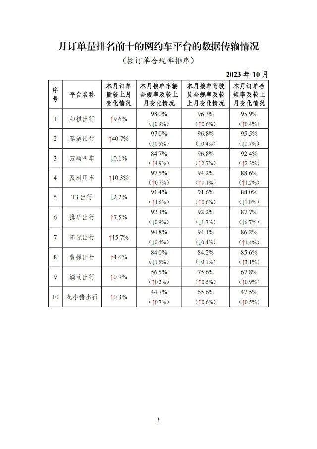 一、在訂單量前10名的網(wǎng)約車平臺(tái)中,訂單合規(guī)率最高的是如祺出行,最低的是花小豬出行。在訂單量前10名的平臺(tái)中,按訂單合規(guī)率(指駕駛員和車輛均獲得許可的訂單量占比)從高到低的分別是如祺出行、享道出行、萬順叫車、及時(shí)用車、T3出行、攜華出行、陽光出行、曹操出行、滴滴出行、花小豬出行。本月訂單合規(guī)率增長前3名的依次是曹操出行、萬順叫車、陽光出行;增長最后3名的依次是享道出行(-0.7%)、T3出行(-1.0%)、攜華出行(-6.7%)。
