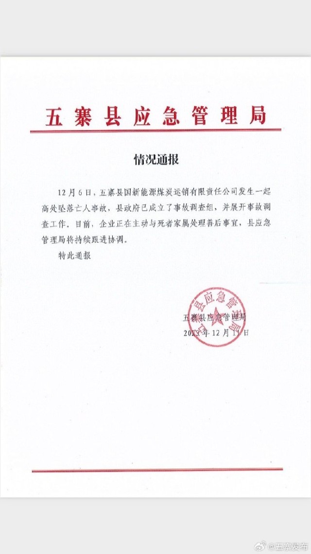 國(guó)新能源煤炭運(yùn)銷公司發(fā)生墜亡事故 山西省忻州市五寨縣官方:展開調(diào)查