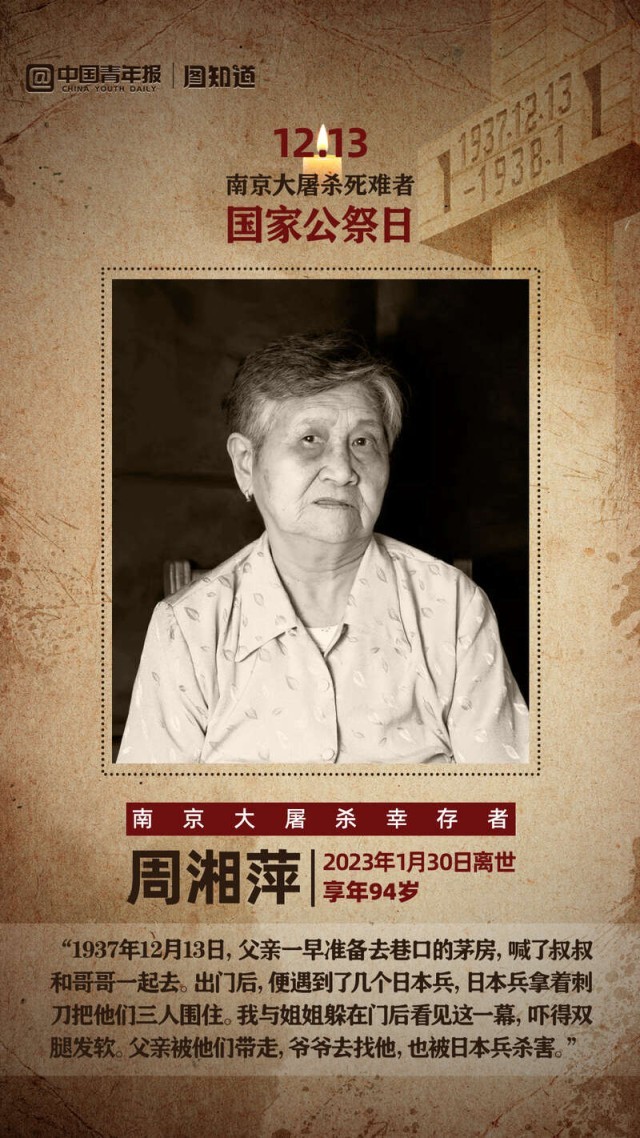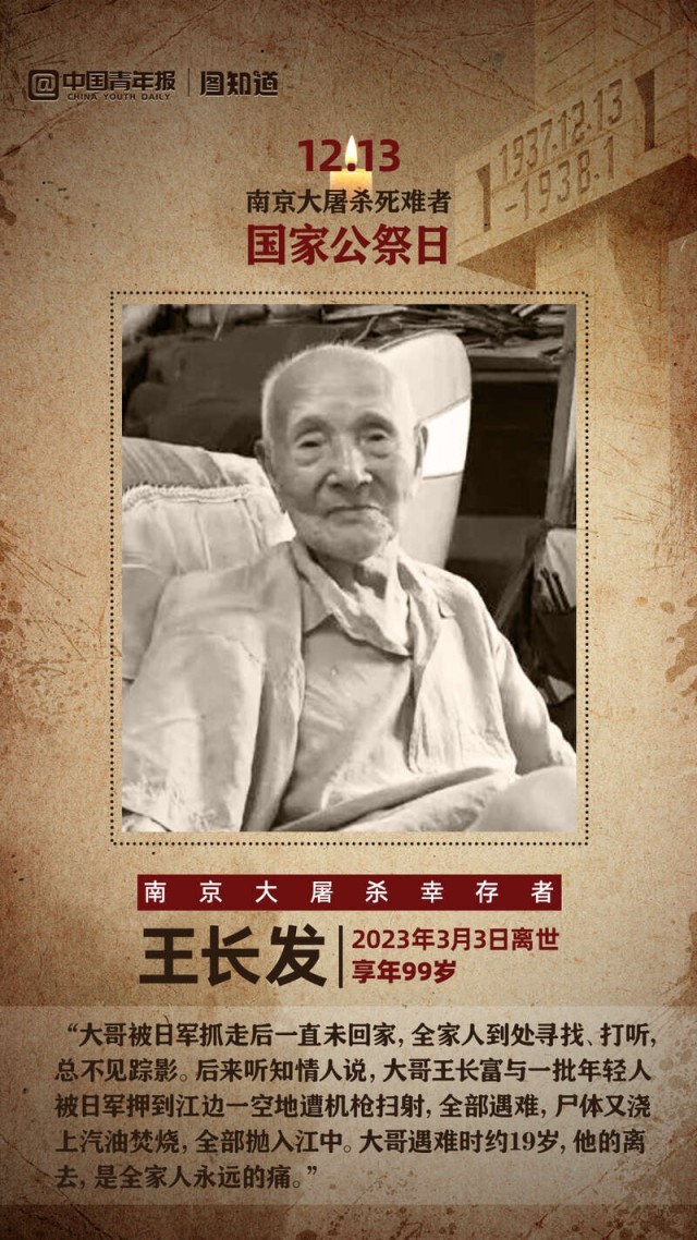 在侵華日軍南京大屠殺遇難同胞紀(jì)念館,有一面南京大屠殺幸存者照片墻。每有一位登記在冊的幸存者離世,就會熄滅一盞燈。但是,他們在生前通過口述等方式將歷史記憶留給了我們。一個個體的生命可能有盡頭,但一個國家、一個民族的記憶將代代相傳。今天是南京大屠殺死難者國家公祭日,共同走近這些老人,他們離去了,但我們可以點亮一盞名為記憶的燈。