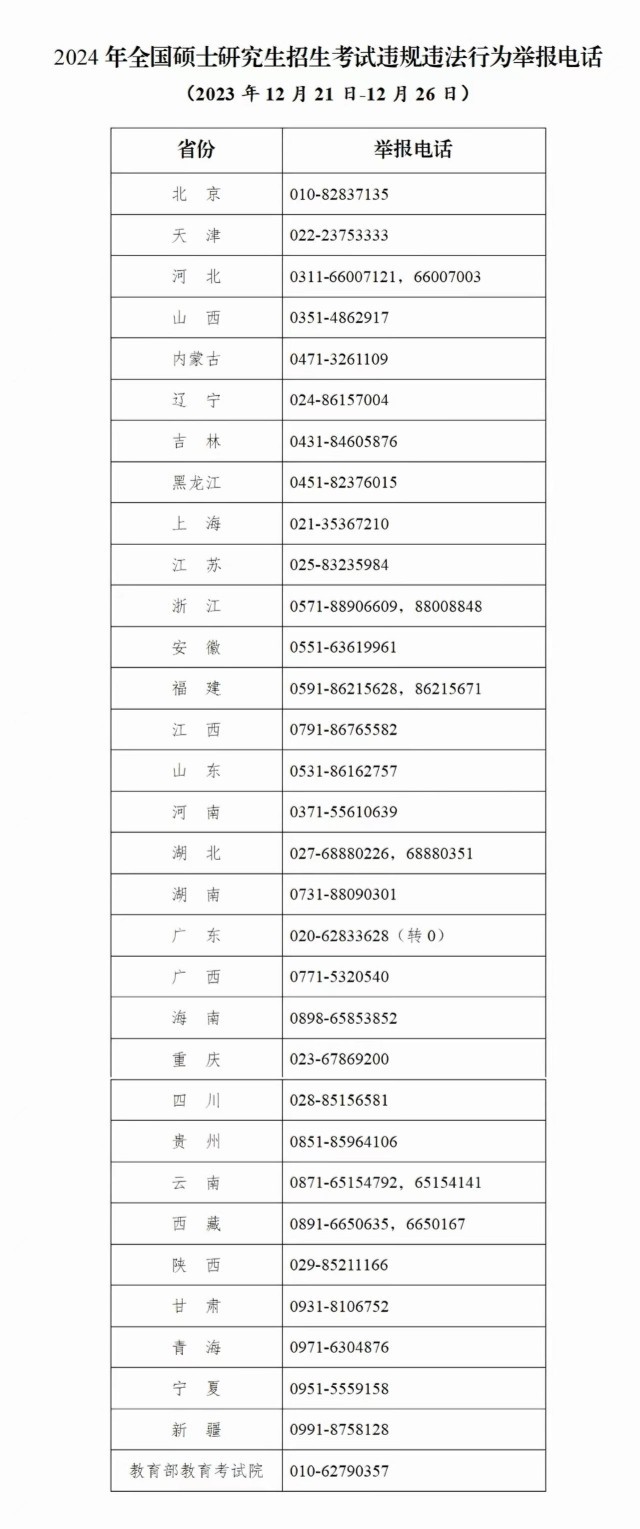 教育部和各?。▍^(qū)、市)教育招生考試機構(gòu)將開通2024年研考舉報電話,歡迎廣大考生及社會各界人士及時舉報反映有關(guān)問題線索。教育部及各?。▍^(qū)、市)將會同有關(guān)部門根據(jù)舉報線索第一時間核查處理,堅決維護風清氣正的研考環(huán)境。