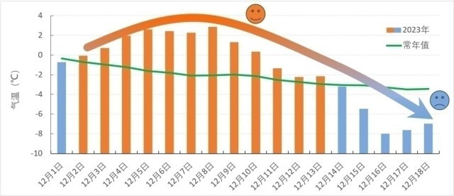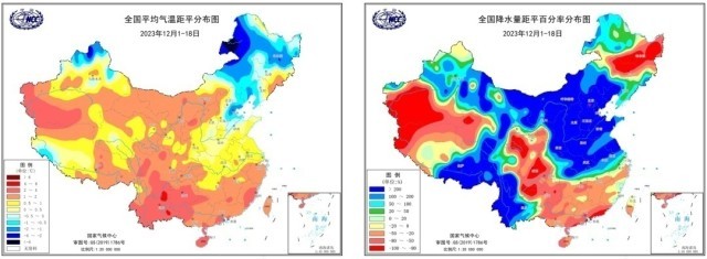 今年12月上旬偏暖顯著,月中降溫幅度大。12月以來(截至18日)北方大部地區(qū)降水顯著偏多。這期間,全國平均氣溫-1.3℃,較常年同期偏高0.9℃,全國大部地區(qū)氣溫以偏高為主。