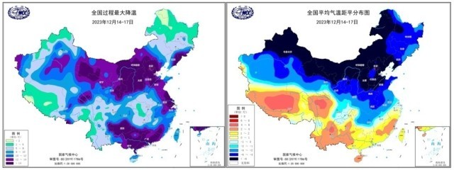 12月14-17日全國大部降溫迅猛(左)氣溫遠低于歷史同期(右,“距平”為實測數(shù)據(jù)與歷史同期之差)