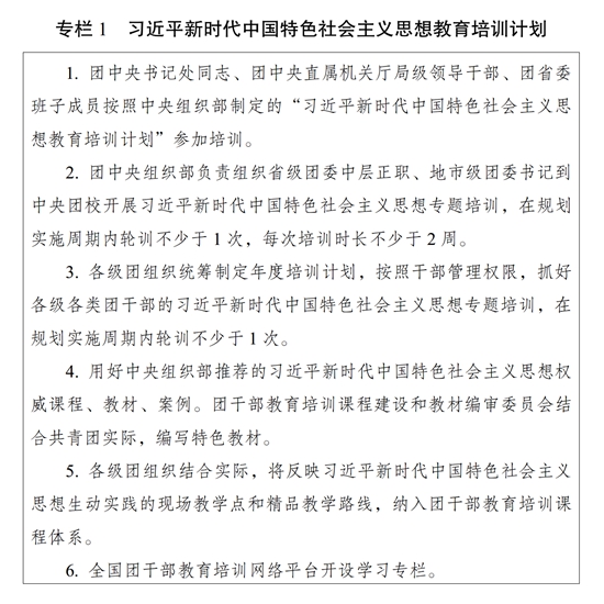 (一)聚焦聚力,久久為功。完善團(tuán)干部理論教育培訓(xùn)長(zhǎng)效機(jī)制,落實(shí)黨的創(chuàng)新理論學(xué)習(xí)教育計(jì)劃,組織實(shí)施習(xí)近平新時(shí)代中國(guó)特色社會(huì)主義思想教育培訓(xùn)計(jì)劃(專欄1),系統(tǒng)謀劃、持續(xù)用力,不斷把思想鑄魂、理論武裝工作引向深入。堅(jiān)持把習(xí)近平新時(shí)代中國(guó)特色社會(huì)主義思想作為團(tuán)的各級(jí)領(lǐng)導(dǎo)機(jī)關(guān)班子成員理論學(xué)習(xí)中心組學(xué)習(xí)首要內(nèi)容,作出具體安排、精心組織實(shí)施;作為各級(jí)團(tuán)干部教育培訓(xùn)機(jī)構(gòu)的主課必修課,辦好理論進(jìn)修班、理論研修班;作為團(tuán)干部學(xué)習(xí)的中心內(nèi)容,全面系統(tǒng)學(xué)、持續(xù)深入學(xué)、聯(lián)系實(shí)際學(xué)。以縣處級(jí)及以上團(tuán)干部為重點(diǎn),開展習(xí)近平新時(shí)代中國(guó)特色社會(huì)主義思想和黨的二十大精神集中輪訓(xùn);深入開展主題教育,通過專題學(xué)習(xí)、研討交流、主題黨課、調(diào)查研究、建章立制等形式,推動(dòng)黨的創(chuàng)新理論學(xué)習(xí)教育走深走實(shí)走心,使廣大團(tuán)干部更加深刻領(lǐng)悟“兩個(gè)確立”的決定性意義,更加自覺增強(qiáng)“四個(gè)意識(shí)”、堅(jiān)定“四個(gè)自信”、做到“兩個(gè)維護(hù)”。深入開展習(xí)近平總書記關(guān)于青年工作的重要思想學(xué)習(xí)培訓(xùn),使廣大團(tuán)干部學(xué)習(xí)掌握黨的青年工作的地位作用、目標(biāo)任務(wù)、職責(zé)使命、實(shí)踐要求,為做好新時(shí)代新征程黨的青年工作打牢思想基礎(chǔ)。