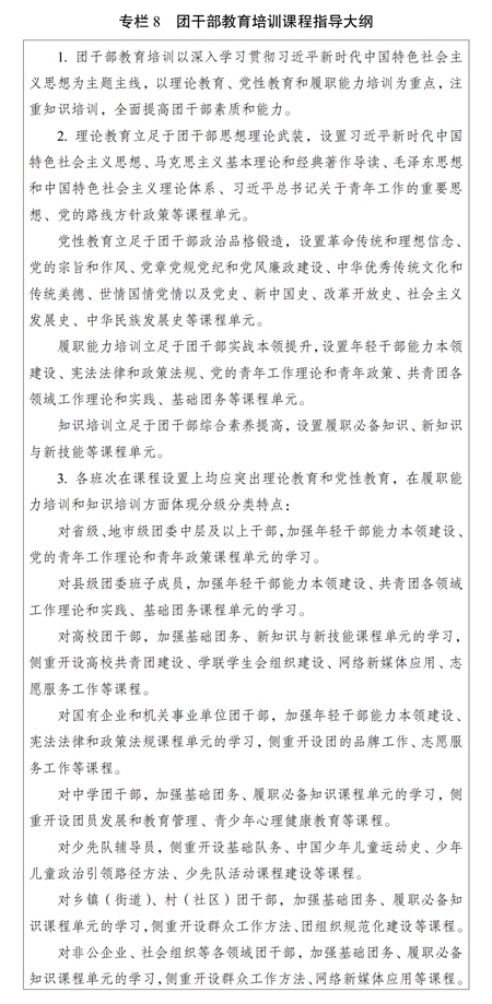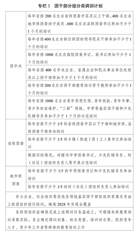 ?。ǘ﹫?jiān)持分級(jí)分類。根據(jù)各級(jí)團(tuán)的領(lǐng)導(dǎo)機(jī)關(guān)干部、高校團(tuán)干部、國(guó)有企業(yè)和機(jī)關(guān)事業(yè)單位單位團(tuán)干部、中學(xué)團(tuán)干部、鄉(xiāng)鎮(zhèn)(街道)團(tuán)(工)委書記、村(社區(qū))團(tuán)組織負(fù)責(zé)人、非公企業(yè)、社會(huì)組織等其他各領(lǐng)域基層團(tuán)干部的不同對(duì)象特點(diǎn),把團(tuán)干部履職能力培訓(xùn)的普遍性要求與不同類別、不同層級(jí)、不同崗位團(tuán)干部的特殊需要結(jié)合起來,整合優(yōu)質(zhì)資源,加強(qiáng)團(tuán)干部教育培訓(xùn)機(jī)構(gòu)與黨校(行政學(xué)院)、干部學(xué)院、黨性教育基地等的合作聯(lián)動(dòng),多渠道多方面開展履職能力培訓(xùn),切實(shí)增強(qiáng)教育培訓(xùn)的時(shí)代性、系統(tǒng)性、針對(duì)性、有效性。發(fā)揮中央團(tuán)校、全國(guó)青少年井岡山革命傳統(tǒng)教育基地主體作用,圍繞黨的中心任務(wù)、黨中央重大決策部署和國(guó)家重大戰(zhàn)略需求開展專題培訓(xùn);發(fā)揮全國(guó)團(tuán)干部教育培訓(xùn)基地優(yōu)勢(shì),開展政策解讀、重點(diǎn)任務(wù)落實(shí)等專題培訓(xùn);發(fā)揮地方團(tuán)干部教育培訓(xùn)機(jī)構(gòu)優(yōu)勢(shì),開展基層團(tuán)干部實(shí)務(wù)培訓(xùn);發(fā)揮全國(guó)團(tuán)干部教育培訓(xùn)網(wǎng)絡(luò)平臺(tái)作用,抓好履職通識(shí)培訓(xùn);加強(qiáng)與派出單位、接收單位的協(xié)作,抓好援派幫扶干部人才、掛職干部等教育培訓(xùn)。積極創(chuàng)造條件,支持干部在職自學(xué)。實(shí)施團(tuán)干部分級(jí)分類調(diào)訓(xùn)計(jì)劃(專欄3)。