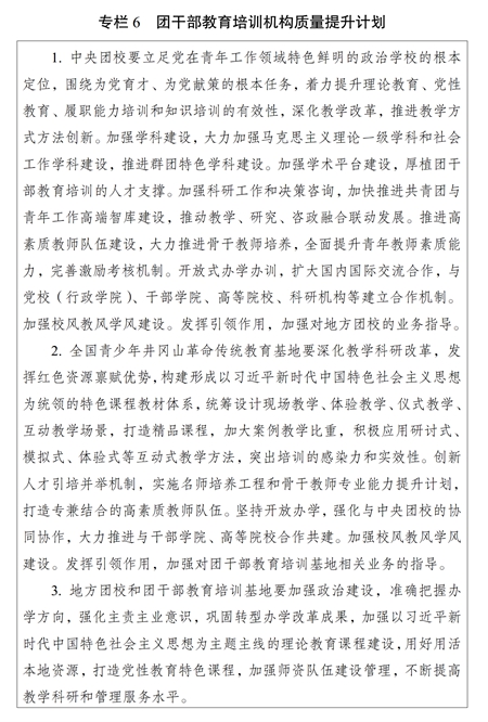 (一)培訓(xùn)機(jī)構(gòu)建設(shè)。加強(qiáng)團(tuán)干部教育培訓(xùn)機(jī)構(gòu)規(guī)范管理和質(zhì)量提升,推進(jìn)各級(jí)團(tuán)校、團(tuán)干部教育培訓(xùn)基地建設(shè),構(gòu)建以中央團(tuán)校、全國(guó)青少年井岡山革命傳統(tǒng)教育基地為龍頭,各級(jí)團(tuán)校、團(tuán)干部教育培訓(xùn)基地相互補(bǔ)充、布局合理、規(guī)范有序的培訓(xùn)機(jī)構(gòu)體系,強(qiáng)化中央團(tuán)校對(duì)地方團(tuán)校的業(yè)務(wù)指導(dǎo),不斷提高辦學(xué)水平。加強(qiáng)各類團(tuán)干部教育培訓(xùn)機(jī)構(gòu)規(guī)范管理,開展團(tuán)干部教育培訓(xùn)機(jī)構(gòu)辦學(xué)質(zhì)量評(píng)估。支持各地各級(jí)團(tuán)組織聯(lián)合開展培訓(xùn),鼓勵(lì)團(tuán)干部教育培訓(xùn)機(jī)構(gòu)開展區(qū)域協(xié)作交流,推動(dòng)優(yōu)質(zhì)培訓(xùn)資源共建共享。實(shí)施團(tuán)干部教育培訓(xùn)機(jī)構(gòu)質(zhì)量提升計(jì)劃(專欄6)。