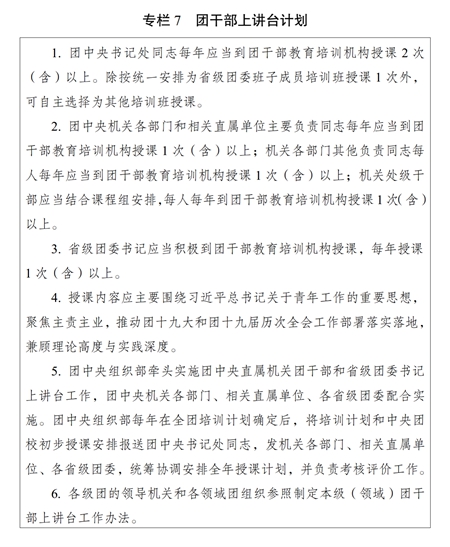 ?。ǘ┩怀觥瓣P(guān)鍵少數(shù)”政治訓(xùn)練。堅(jiān)持把政治訓(xùn)練貫穿團(tuán)干部成長(zhǎng)全周期,使團(tuán)干部的政治素養(yǎng)、政治能力與擔(dān)負(fù)的領(lǐng)導(dǎo)職責(zé)相匹配。強(qiáng)化“一把手”政治培訓(xùn),有計(jì)劃地選調(diào)團(tuán)的各級(jí)領(lǐng)導(dǎo)機(jī)關(guān)主要負(fù)責(zé)同志到團(tuán)干部教育培訓(xùn)機(jī)構(gòu)參加專題培訓(xùn)。強(qiáng)化對(duì)團(tuán)縣(市、區(qū)、旗)委書記這一群體的培訓(xùn),實(shí)施團(tuán)縣(市、區(qū)、旗)委書記能力提升計(jì)劃(專欄2)。突出對(duì)團(tuán)的領(lǐng)導(dǎo)機(jī)關(guān)干部的政治訓(xùn)練,各級(jí)團(tuán)的領(lǐng)導(dǎo)機(jī)關(guān)加強(qiáng)對(duì)機(jī)關(guān)干部的常態(tài)化政治能力培訓(xùn)。加強(qiáng)對(duì)青年人才的政治引領(lǐng),團(tuán)中央組織部會(huì)同有關(guān)單位每年組織一定數(shù)量青年人才開展國(guó)情研修。積極推動(dòng)將地方團(tuán)的領(lǐng)導(dǎo)機(jī)關(guān)班子成員培訓(xùn)納入地方黨委組織開展的干部政治理論培訓(xùn)范疇。