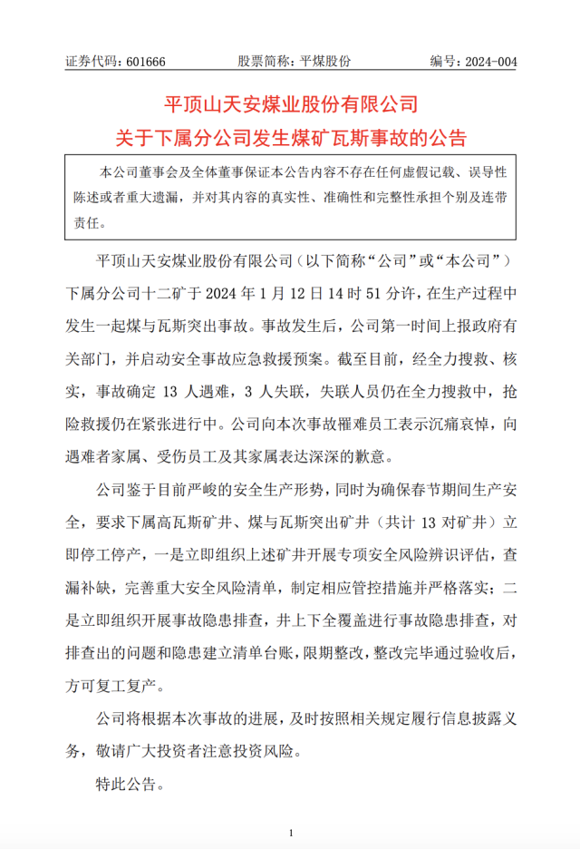 央視網(wǎng)消息:1月14日,平煤股份發(fā)布公告,下屬分公司十二礦于2024年1月12日14時(shí)51分許,在生產(chǎn)過(guò)程中發(fā)生一起煤與瓦斯突出事故。事故發(fā)生后,公司第一時(shí)間上報(bào)政府有關(guān)部門(mén),并啟動(dòng)安全事故應(yīng)急救援預(yù)案。截至目前,經(jīng)全力搜救、核實(shí),事故確定13人遇難,3人失聯(lián),失聯(lián)人員仍在全力搜救中,搶險(xiǎn)救援仍在緊張進(jìn)行中。公司向本次事故罹難員工表示沉痛哀悼,向遇難者家屬、受傷員工及其家屬表達(dá)深深的歉意。