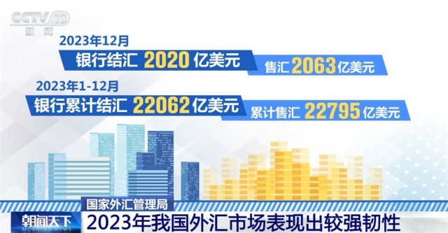 國家外匯管理局最新數(shù)據(jù)顯示,2023年12月,銀行結(jié)匯2020億美元,售匯2063億美元。2023年1—12月,銀行累計結(jié)匯22062億美元,累計售匯22795億美元。
