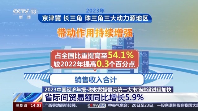 國家稅務(wù)總局新聞發(fā)言人 黃運:2023年,衡量國內(nèi)各省之間貿(mào)易聯(lián)系緊密程度的省際間貿(mào)易額同比增長5.9%,占全國貿(mào)易總額比重提高至42.7%,較2022年提高0.5個百分點,而且也呈逐年提升的態(tài)勢,反映經(jīng)濟(jì)內(nèi)循環(huán)更加順暢,統(tǒng)一大市場建設(shè)進(jìn)程加快。