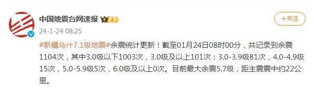 截至24日8時 新疆烏什7.1級地震共記錄到余震1104次