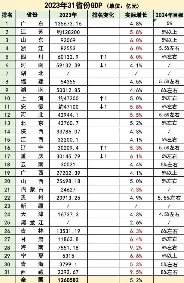 西藏、海南分別以9.5%、9.2%的增速領(lǐng)先,而在已公布數(shù)據(jù)的省份中黑龍江增速較低,為2.6%。值得一提的是,2023年,廣東、山東、四川、湖南等多個(gè)省份邁上各自的“萬億”新臺階,江蘇、山東、浙江等經(jīng)濟(jì)大省表現(xiàn)亮眼,扛起了增長的大旗。