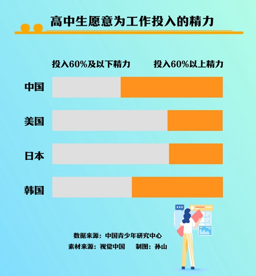對于未來的工作,受訪高中生愿意投入多少精力?調(diào)查發(fā)現(xiàn),假設(shè)全部精力是100%,愿意為工作投入80%以上精力的中國高中生占比16.2%,愿意投入60%到80%精力的高中生占比43.8%,合計有六成受訪中國高中生愿意為工作投入60%以上精力,在四國受訪高中生中最高,其次是韓國高中生(53.3%),美國和日本高中生愿意投入60%以上精力的比例均只有三成多(32.4%和31.6%)??梢?,中國和韓國高中生更愿意投入較多精力在工作上。