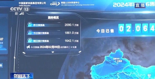 總臺(tái)央視記者 陳晰:40天春運(yùn),全國(guó)鐵路預(yù)計(jì)發(fā)送旅客4.8億人次,日均1200萬(wàn)人次。今天是春運(yùn)首日,全國(guó)鐵路預(yù)計(jì)發(fā)送旅客1060萬(wàn)人次。2024年春運(yùn)的火車(chē)票預(yù)售已經(jīng)從1月12日開(kāi)始發(fā)售,從目前的售票情況來(lái)看,旅客出行需求旺盛。