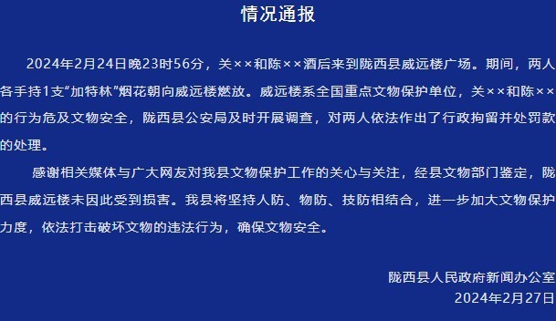 2024年2月24日晚23時56分,關(guān)××和陳××酒后來到隴西縣威遠(yuǎn)樓廣場。期間,兩人各手持1支“加特林”煙花朝向威遠(yuǎn)樓燃放。威遠(yuǎn)樓系全國重點(diǎn)文物保護(hù)單位,關(guān)××和陳××的行為危及文物安全,隴西縣公安局及時開展調(diào)查,對兩人依法作出了行政拘留并處罰款的處理。
