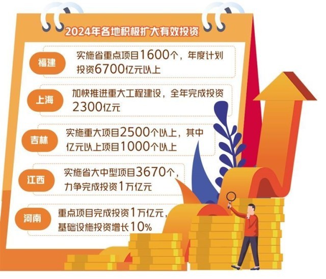 各地2024年政府工作報告中對今年如何擴大有效投資進行了系統(tǒng)部署,不少地方還公布了具體金額。比如,福建將謀劃實施省重點項目1600個、年度計劃投資6700億元以上;上海今年將加快推進重大工程建設,全年完成投資2300億元;吉林今年計劃實施重大項目2500個以上,其中億元以上項目1000個以上;江西今年實施省大中型項目3670個,力爭完成投資1萬億元;河南重點項目完成投資1萬億元,基礎設施投資增長10%;安徽開展先進制造業(yè)投資“領跑”計劃,制造業(yè)投資增長10%以上。