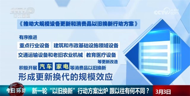 央視網(wǎng)消息:日前,國務(wù)院常務(wù)會議審議通過了《推動大規(guī)模設(shè)備更新和消費品以舊換新行動方案》。行動方案有哪些亮點?新一輪“以舊換新”和以往有什么不同?來看專家的解讀。