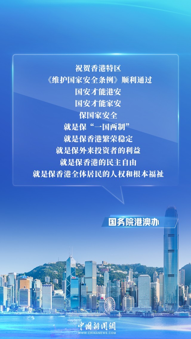 國務院港澳辦強調(diào),香港國安條例順利通過,為保持香港長期繁榮穩(wěn)定、推動“一國兩制”實踐行穩(wěn)致遠提供更加堅實的制度保障。香港國安條例全面有效維護國家安全,充分尊重和保障人權,更好統(tǒng)籌發(fā)展和安全。
