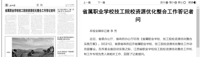 3月24日,《江西日報(bào)》發(fā)布了《省屬職業(yè)學(xué)校技工院校資源優(yōu)化整合工作答記者問》。