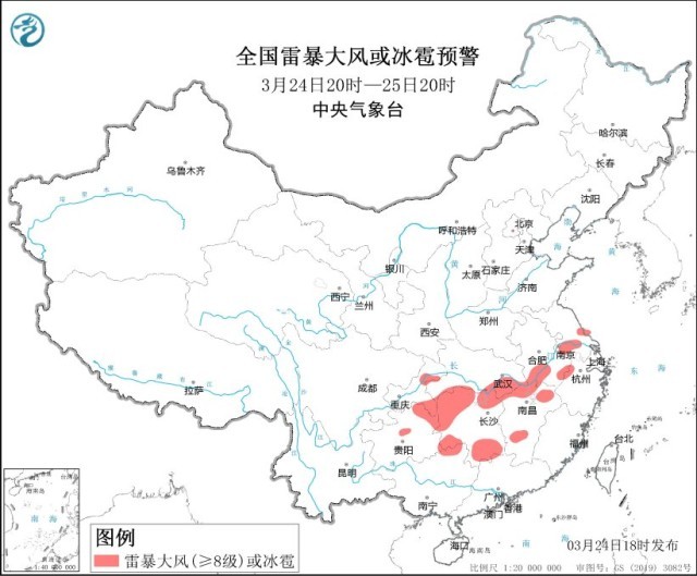 央視網消息:中央氣象臺3月24日18時繼續(xù)發(fā)布強對流天氣藍色預警。預計3月24日20時至25日20時,安徽中南部、江蘇中南部、湖北東部和南部、重慶東部、貴州東部、湖南北部和東南部、江西東北部和中南部、浙江西北部、廣西東北部等地的部分地區(qū)將有8-10級雷暴大風或冰雹天氣;安徽中南部、江蘇中南部、上海北部和西部、湖北東部和南部、重慶東部、貴州東部、湖南、江西、浙江西北部、廣西東北部、廣東西北部等地的部分地區(qū)將有短時強降水天氣,最大小時雨量20-40毫米,局地可達50毫米以上。