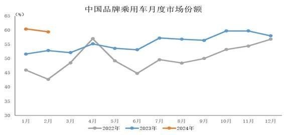 2024年1-2月,中國(guó)品牌乘用車銷量206.6萬(wàn)輛,同比增長(zhǎng)26.7%,市場(chǎng)份額為59.9%,上升7.6個(gè)百分點(diǎn)。