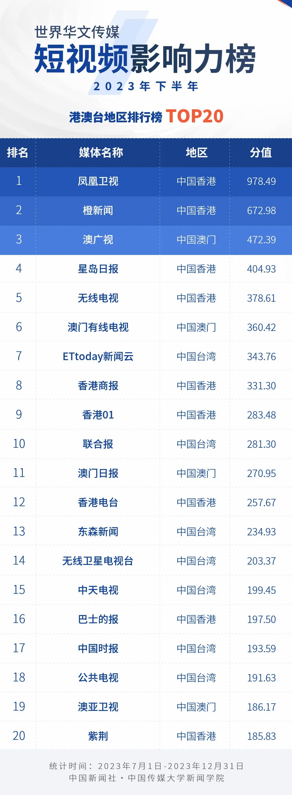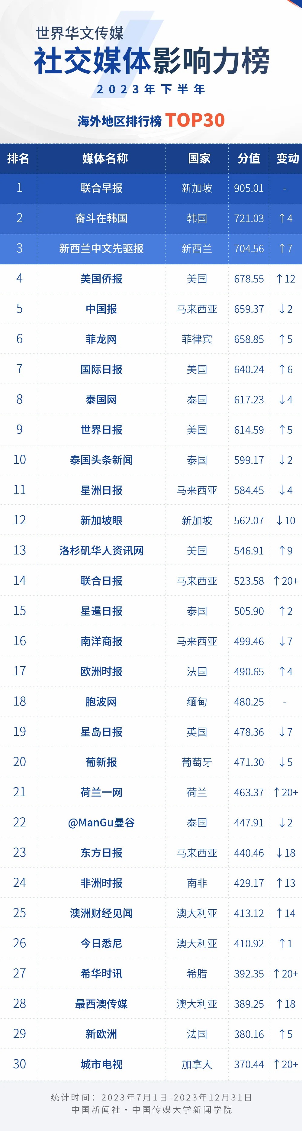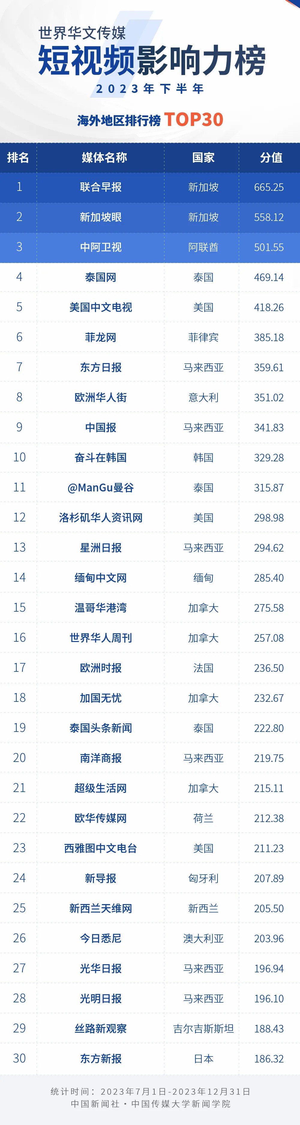 中國新聞社與中國傳媒大學(xué)新聞學(xué)院持續(xù)開展“世界華文傳媒新媒體影響力”測評(píng)項(xiàng)目,現(xiàn)根據(jù)2023年下半年世界華文傳媒新媒體的業(yè)務(wù)數(shù)據(jù),發(fā)布2023年下半年榜。