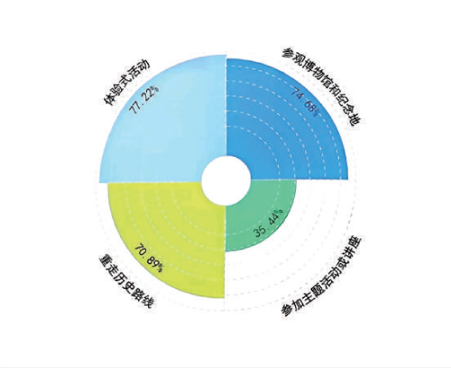 愛國主義教育入耳、入腦,更入心。此次調(diào)研中,79.75%的受訪者參與過紅色旅游,年齡主要集中在18~35歲之間。超過70%的人選擇參觀博物館和紀念地(74.68%)、重走歷史路線(70.89%)以及體驗式活動(77.22%)三種形式,90.87%的受訪者表示,參與紅色旅游的目的是學習歷史文化知識、接受紅色文化洗禮。