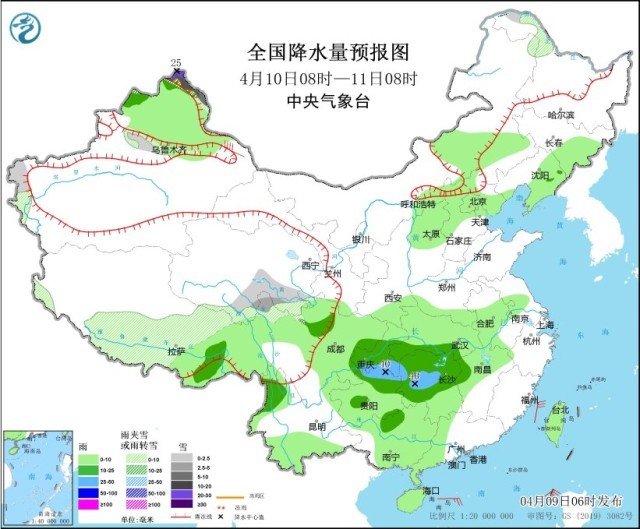 4月9日08時至10日08時,內(nèi)蒙古東北部、黑龍江西北部、新疆北疆北部和伊犁河谷、西藏北部和西部、青海中部和北部、川西高原北部等地部分地區(qū)有小到中雪或雨夾雪,其中,新疆北疆北部等地局部有大到暴雪(10~18毫米)。新疆北部、內(nèi)蒙古中部、華北北部、西藏中部和東南部、青海東部、甘肅中部和南部、寧夏、陜西北部和西南部、四川盆地大部、重慶、湖北西部、貴州北部、湖南北部、云南西部和東南部、廣西東南部、海南島、臺灣島等地部分地區(qū)有小到中雨,其中,西藏東南部局地有大雨(25~30毫米)。新疆北疆沿天山地區(qū)、甘肅西部、內(nèi)蒙古西北部、黑龍江東北部、西藏中部等地部分地區(qū)有4~6級風。東海大部海域、臺灣海峽、臺灣以東洋面、巴士海峽、南海東北部海域?qū)⒂?~7級、陣風8級的風,其中臺灣海峽的部分海域風力可達8級、陣風9級。