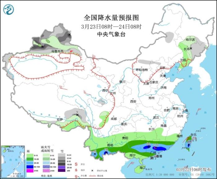 3月23日08時(shí)至24日08時(shí),新疆北部和西部山區(qū)、吉林中東部、西藏東北部等地部分地區(qū)有小到中雪或雨夾雪,其中,新疆北疆東部和伊犁河谷部分地區(qū)有大到暴雪(10~18毫米)。云南南部、華南、臺(tái)灣島等地部分地區(qū)有中到大雨,其中,云南東南部、廣西東部、廣東中部和東部、臺(tái)灣島中南部等地部分地區(qū)有暴雨或大暴雨(100~110毫米)。內(nèi)蒙古西部、青海、新疆東部等地部分地區(qū)有4~6級(jí)風(fēng),其中,新疆東部部分地區(qū)有7~8級(jí)風(fēng)(見圖3)。