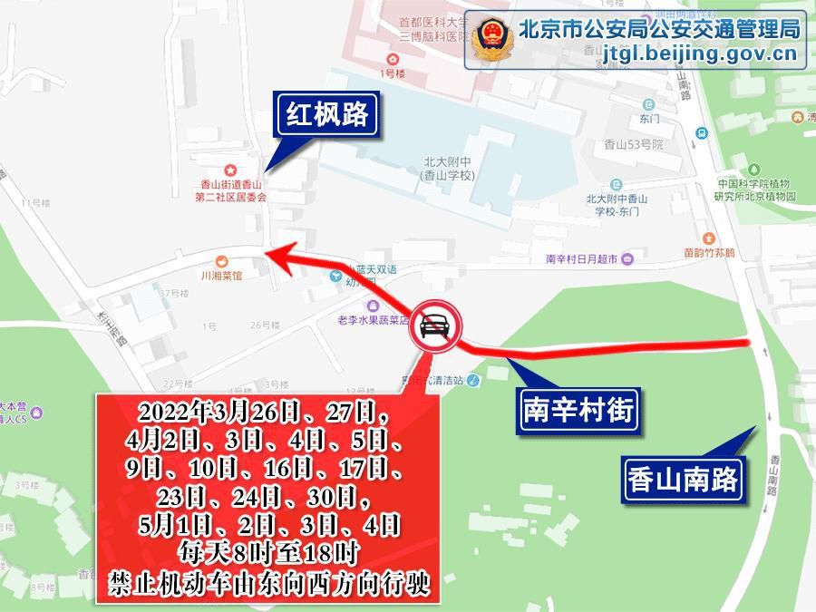 特別提示去往香山地區(qū)的市民朋友:4月2日、3日、4日、5日、9日、10日、16日、17日、23日、24日,5月1日、2日、3日、4日,每天8時(shí)至18時(shí),南辛村街(紅楓路至香山南路段)禁止機(jī)動(dòng)車(chē)由東向西方向行駛。