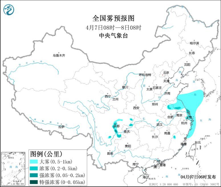 中新網4月7日電 據(jù)中央氣象臺網站消息,預計4月7日早晨至夜間,黃海中部和南部海域、東海西部海域、江蘇東部沿岸海域、長江口附近海域、浙江東部沿岸海域、福建東北部沿岸海域將有能見度不足1公里的大霧天氣。此外,7日早晨至上午,四川盆地西部和南部、重慶中部、安徽北部、江蘇北部和東部、上海、浙江東北部等地的部分地區(qū)有大霧天氣,局地有能見度不足500米的濃霧(見圖1)。為此,中央氣象臺7日6時繼續(xù)發(fā)布大霧黃色預警。7日至9日,西南地區(qū)多陰雨,西藏東南部、四川南部、云南中西部和北部、貴州西部等地有中到大雨。