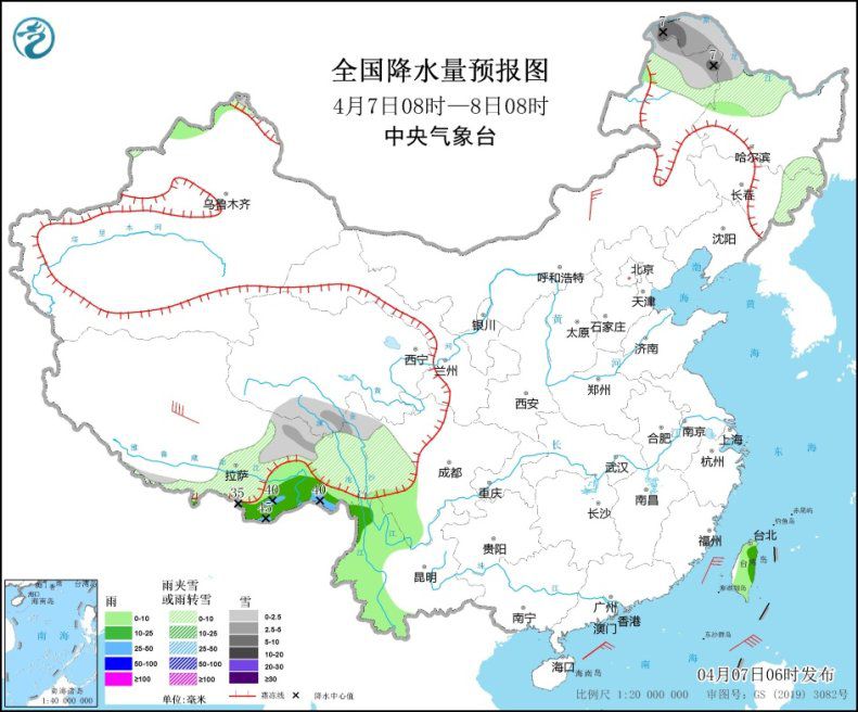 4月7日08時至8日08時,新疆北疆北部、西藏東部、青海南部、川西高原西北部、內蒙古東北部、黑龍江西北部和東南部、吉林東部等地的部分地區(qū)有小到中雪或雨夾雪,其中內蒙古東北部、黑龍江西北部等地局地大雪(5~7毫米);西藏東南部、四川西南部、云南中西部及臺灣島等地的部分地區(qū)有小到中雨,其中西藏東南部等地局地大雨(25~45毫米)。內蒙古中東部、西藏中南部等地的部分地區(qū)有4~6級風,其中西藏中部的部分地區(qū)有7~8級風(見圖2)。