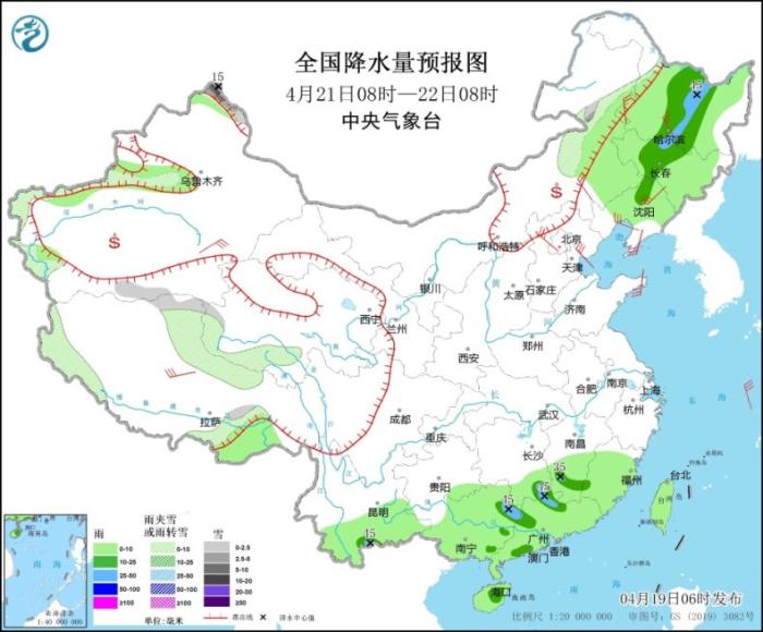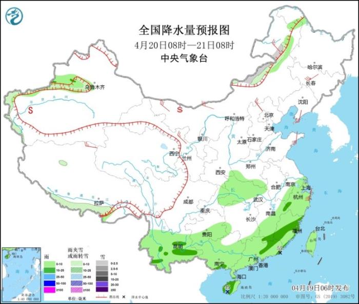 4月19日08時(shí)至20日08時(shí),新疆北疆北部、青海東部、甘肅西南部、川西高原北部等地的部分地區(qū)有小到中雪或雨夾雪;四川南部、貴州中西部、云南東部和南部、福建南部、廣東、臺(tái)灣島等地的部分地區(qū)有中到大雨,其中云南南部等地局地暴雨(50~55毫米)。新疆北部和沿天山地區(qū)、內(nèi)蒙古、東北地區(qū)、山東半島、西藏中東部、青海南部和東部等地的部分地區(qū)有4~6級(jí)風(fēng),其中新疆北部、西藏中部部分地區(qū)有6~7級(jí)風(fēng)(見圖1);渤海有5~6級(jí)、陣風(fēng)7級(jí)的西南風(fēng),臺(tái)灣海峽、南海北部海域有5~6級(jí)、陣風(fēng)7級(jí)的偏東到東北風(fēng)。