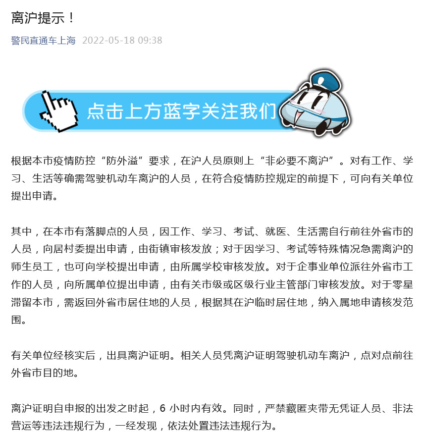 中新網(wǎng)5月18日電 據(jù)上海市公安局微信公眾號消息,根據(jù)上海市疫情防控“防外溢”要求,在滬人員原則上“非必要不離滬”。對有工作、學(xué)習(xí)、生活等確需駕駛機(jī)動車離滬的人員,在符合疫情防控規(guī)定的前提下,可向有關(guān)單位提出申請。有關(guān)單位經(jīng)核實后,出具離滬證明。相關(guān)人員憑離滬證明駕駛機(jī)動車離滬,點對點前往外省市目的地。離滬證明自申報的出發(fā)之時起,6 小時內(nèi)有效。同時,嚴(yán)禁藏匿夾帶無憑證人員、非法營運等違法違規(guī)行為,一經(jīng)發(fā)現(xiàn),依法處置違法違規(guī)行為。