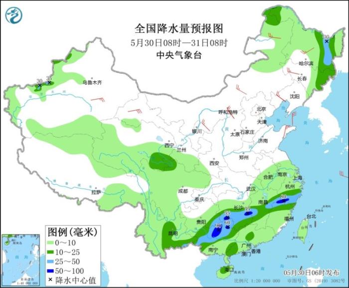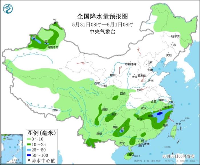 5月30日08時(shí)至31日08時(shí),新疆西部、青藏高原北部和東部、內(nèi)蒙古東北部、黑龍江、吉林東部、江南大部、云南、貴州中南部、華南、蘇皖中南部等地的部分地區(qū)有小到中雨,其中,浙江南部、福建北部、江西中部、湖南中南部、廣西北部以及黑龍江東部、新疆南疆西部等地的部分地區(qū)有大雨,局地有暴雨(50~90毫米)。內(nèi)蒙古中東部、東北地區(qū)、山西北部、河北北部等地的部分地區(qū)有4~6級(jí)風(fēng)。黃海北部和東海北部海域有4~6級(jí)、陣風(fēng)7級(jí)的偏西風(fēng),東海南部和南海西南部海域有4~6級(jí)、陣風(fēng)7級(jí)的西南風(fēng)。