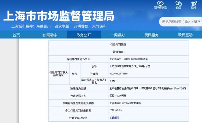 沃爾瑪上海一分店因售賣過期牛奶被罰3萬(wàn)元