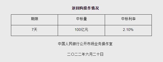 央行6月20日開展100億元逆回購操作 中標(biāo)利率2.10%
