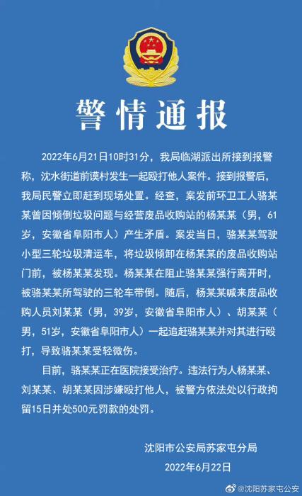中新網(wǎng)6月23日電 據(jù)遼寧省沈陽市公安局蘇家屯分局官方微博消息,6月21日10時31分,該局臨湖派出所接到報(bào)警稱,沈水街道前謨村發(fā)生一起毆打他人案件。經(jīng)查,案發(fā)前環(huán)衛(wèi)工人駱某某曾因傾倒垃圾問題與經(jīng)營廢品收購站的楊某某(男,61歲,安徽省阜陽市人)產(chǎn)生矛盾。