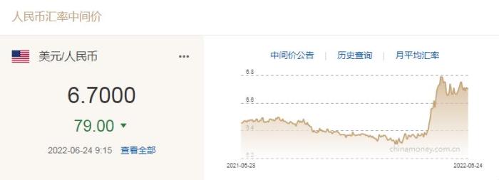 人民幣兌美元中間價報6.7000,上調(diào)79個基點