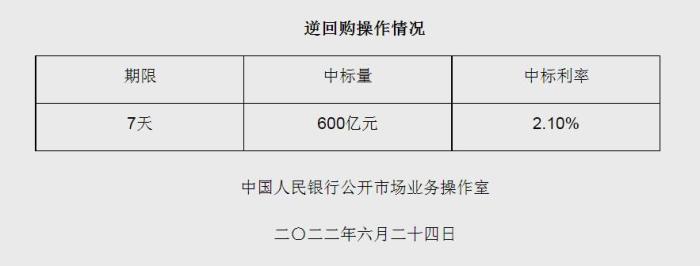 央行6月24日開(kāi)展600億元逆回購(gòu)操作 中標(biāo)利率2.10%