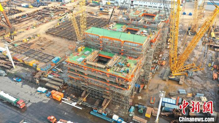 墾利6-1油田5-1/5-2/6-1區(qū)塊WHPB(井口平臺)組塊主結(jié)構(gòu)成功封頂。 中國海油天津分公司供圖